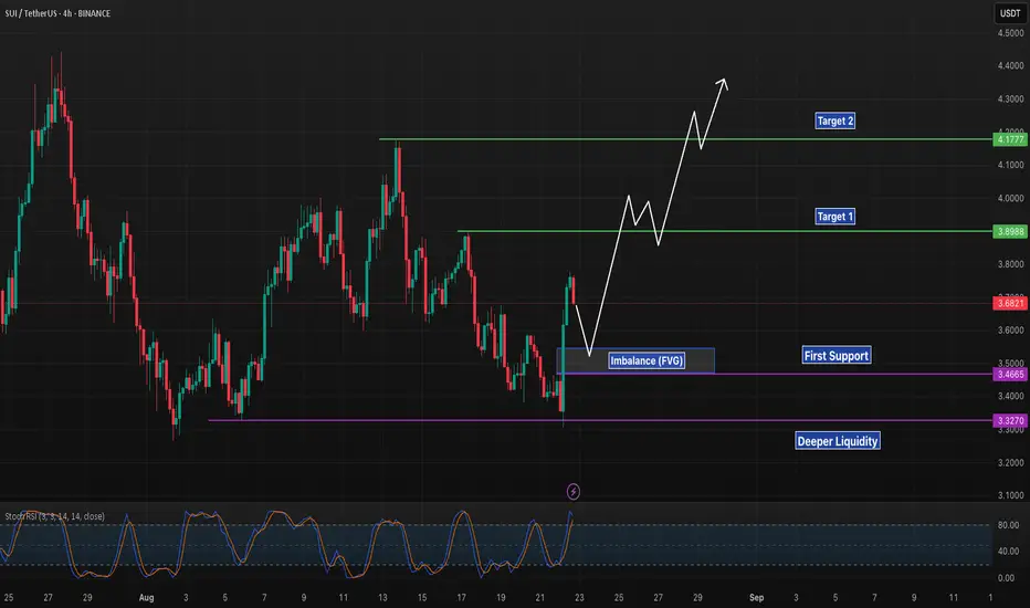 SUI bounced sharply after sweeping liquidity near 3.32 and is now testing the 3.55–3.47 demand zone.