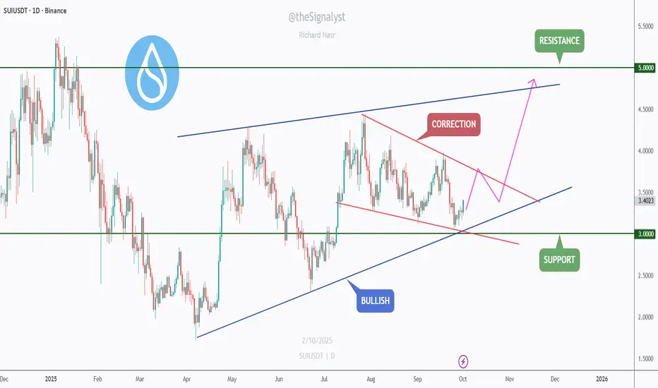 SUI is respecting a broader rising structure while carving a descending correction (red channel/wedge) on the daily.