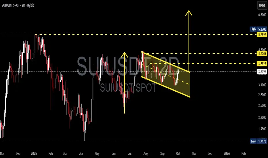 SUI is consolidating inside a Bullish Flag, a classic continuation pattern. A confirmed breakout could trigger a move towards $5.37, with an extended upside target near $7.0. Failure to break out, however, would bring price back to supports around $2.80 – $1.72.