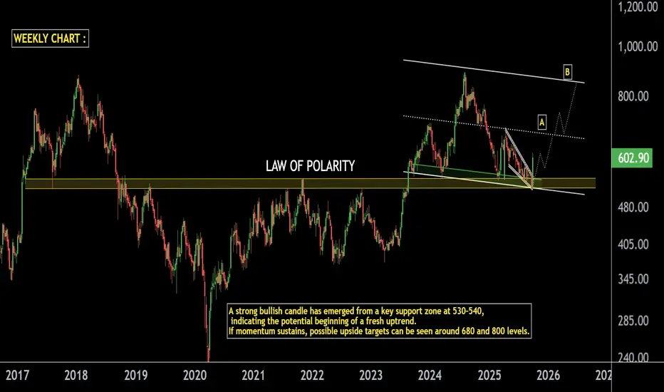 Support Zone: Stock is respecting the long-term LOP with strong support in the 520–530 range.