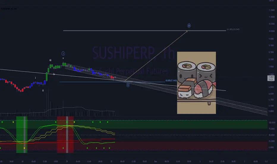 sushi came up in 5 waves from the other day, and has been retracing very smoothly in a phase of accumulation into this high area of liquidity at 7.15ish