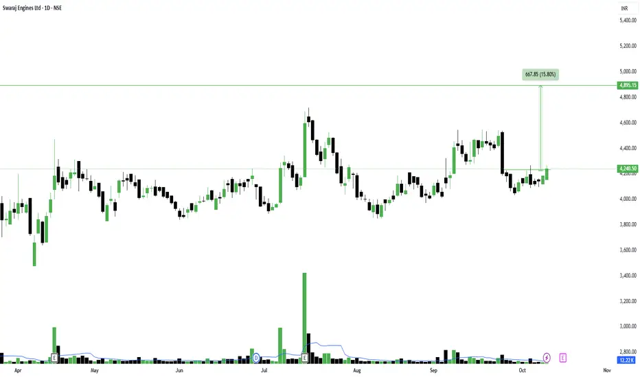 Swaraj Engines is preparing for a potential breakout from a wide consolidation base. For the past several months, the stock has been moving in a range between 4050–4500, forming multiple shakeouts that cleared weaker hands from the structure.