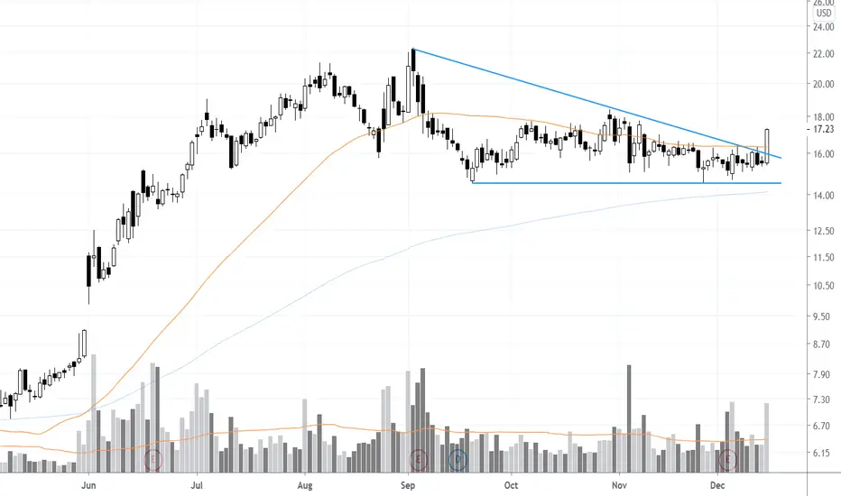 Smith and Wesson might have put in a bottom testing its 200 MA and breaking strongly above its 50 MA that was acting as resistance. In doing so, the stock also cleared a 3 month down trendline. Looks interesting for a long swing trade back to the highs set in early September.