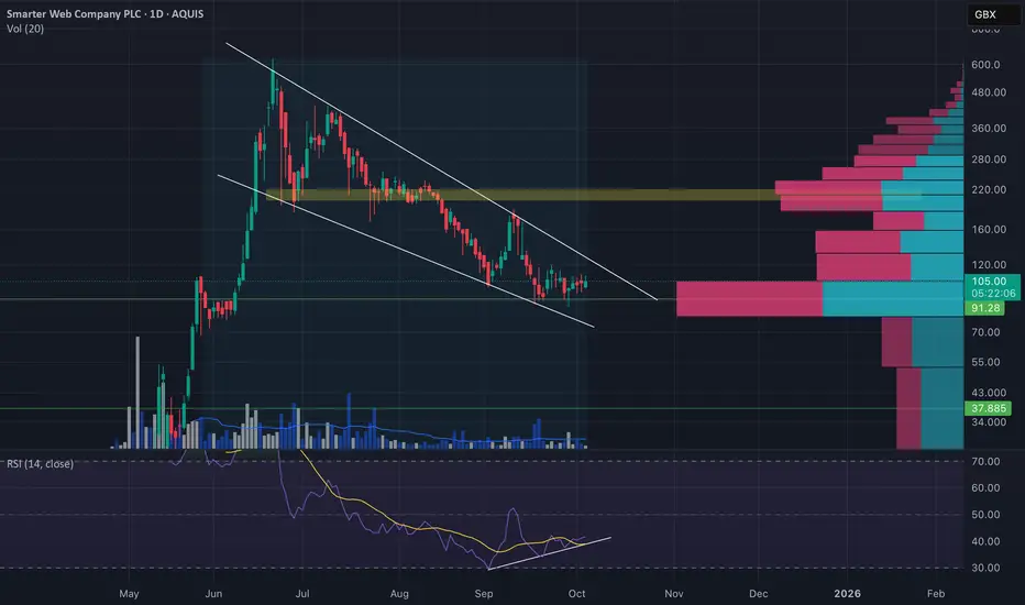 Smarter Web Company stock hasn't reacted at all yet to BTC's recent rally, but we can see price compressing under the $109 res, around the volume POC. This, coupled with the strong bullish RSI divergence and falling wedge pattern, suggests to me that a volatile move is brewing.