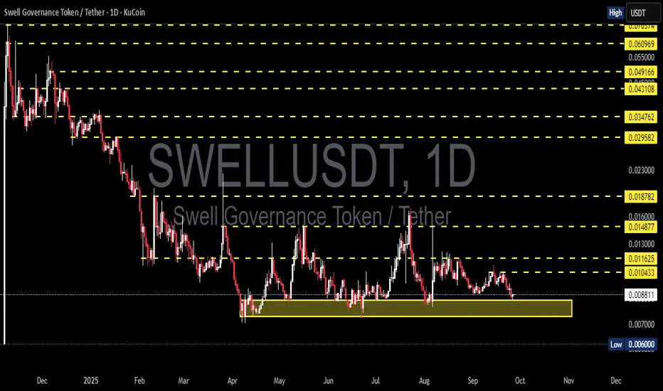 SWELL is currently at a critical juncture. After a prolonged downtrend since early 2025, the price has shifted into a range-bound structure, with a strong demand zone around 0.0060 – 0.0088 (highlighted in yellow).