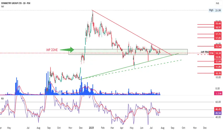 Asymmetrical Triangle pattern. Can or may break in the direction of the original trend, which as per chart is on the upside. The marked zone is of significance and needs to be sustained for upward move.