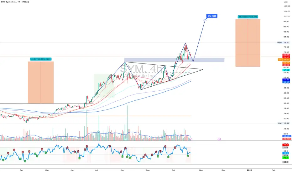 Symbotic Inc. shows a clean setup: after a strong rally and breakout from a triangle, the stock is now retesting the $68–70 support zone. The 50-day moving average aligns perfectly here, strengthening the buyers’ defense.