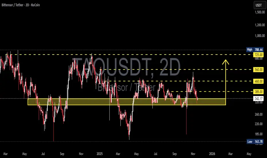 TAO/USDT is now sitting on one of the most critical price zones of its entire mid-term structure.