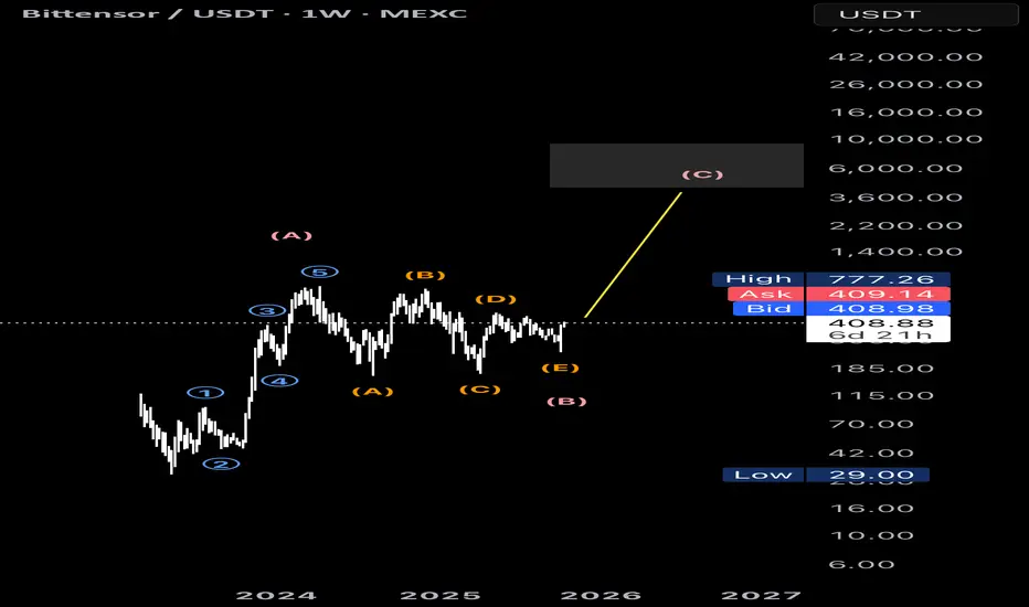 • Interim target: Retest of the prior high near 777, then intermediate extensions around 1,100–1,700, with the main Wave (C) objective at 4,346.