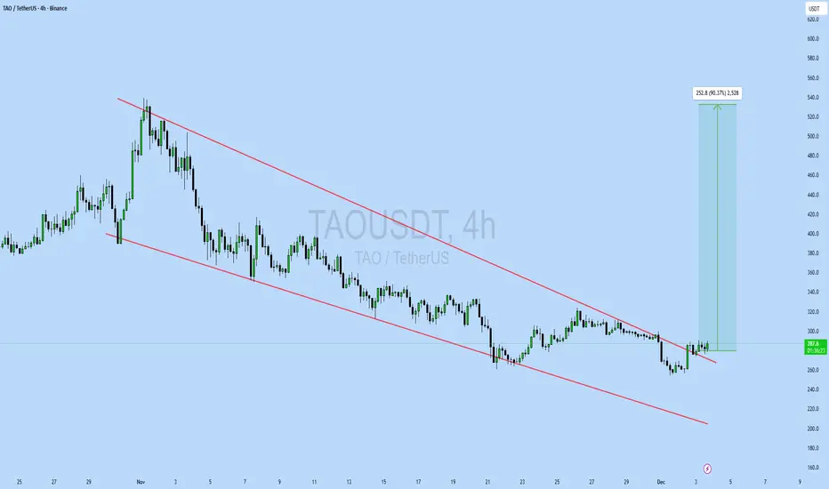 Technical Analysis: TAO is breaking out of a falling wedge pattern on the 4H chart, signaling a bullish reversal after an extended corrective move. Price has successfully pushed above the descending resistance trendline, showing improving market structure and renewed buying momentum. The breakout opens the door for a continuation move toward the projected upside target, as long as price holds above the breakout zone and invalidation support remains intact.