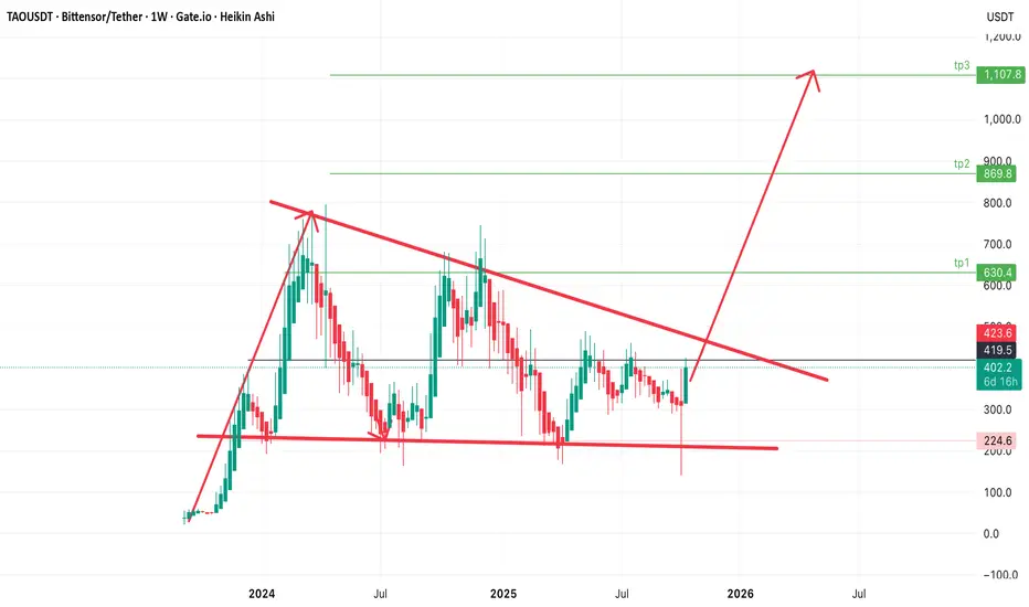 Price recently bounced strongly from around $315 to $401, signaling momentum building toward a potential breakout of the triangle.