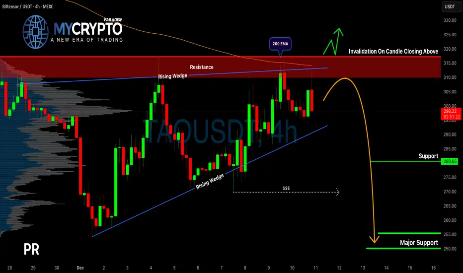💎TAOUSDT is currently reacting from a strong resistance zone and what makes things even more interesting is the rising wedge pattern that has formed in this area. This type of structure historically points to a higher probability of a bearish move, and right now, the conditions are lining up for potential downside.