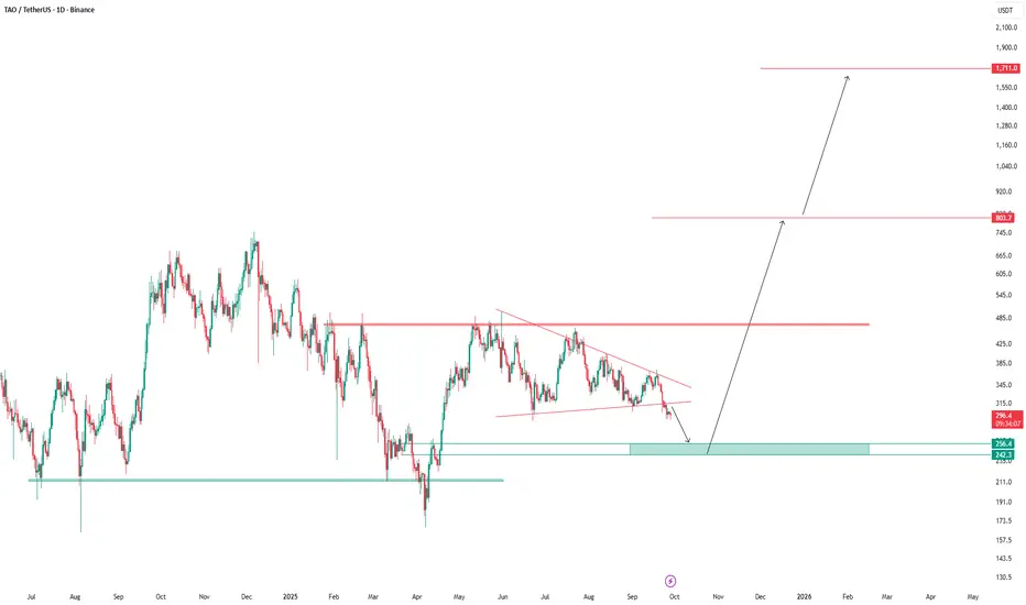 TAO is consolidating inside a descending triangle, with sellers pressing from above and buyers defending the $256–$242 support zone.