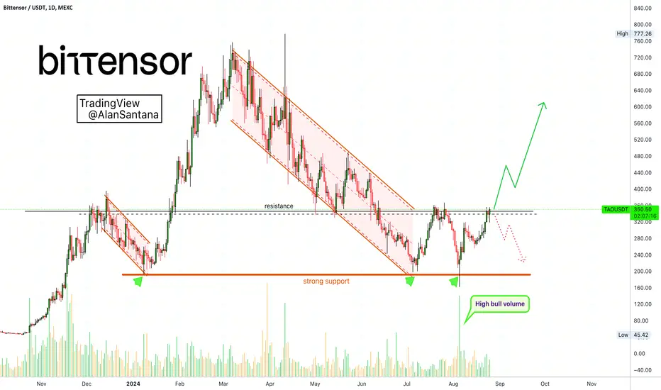 Current price action is sending prices back above the "resistance" level, the black thin line and this puts TAOUSDT on bullish grounds. The thing is that the situation is still active, resistance is being challenged now, not yet broken and thus anything goes; this is a decision point.