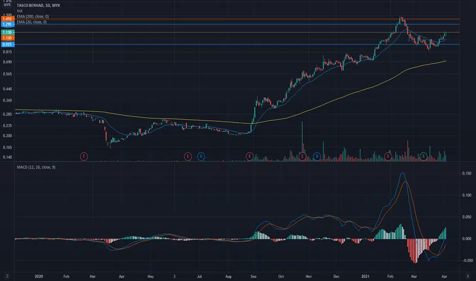 TASCO is in an uptrend and it tend to respect the 20 ema. the price has been under the 20 ema for a while but now it have been back above the ema 20. (1.13) is the resistance to break for TASCO to continue its uptrend. it it fail to open above 1.13 when the market open tomorrow, im expecting a re-test to 20 ema and then TASCO will likely to break the 1.13 resistance and continue the uptrend to the previous swing high which is 1.41. NOT A BUY CALL, JUST FOR LEARNING PURPOSE.