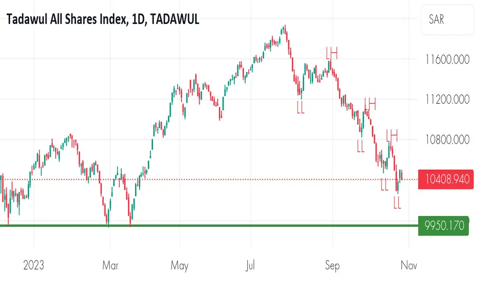 The Tadawul All Shares Index, or TASI, is currently trading around 10,408. The current pattern suggests that the index is in a down trend, making lower lows and lower highs, notable support is around 9,950. If selling pressure minimize and sustains the support level, pull back is expected.