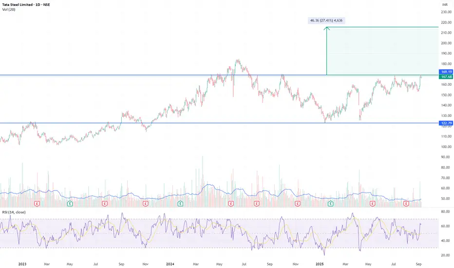 Tata Steel is testing a major resistance zone around ₹169 after consolidating in a wide range (115–170) for nearly 2 years. A decisive breakout here would mark the completion of a multi-year rounding base, opening the path to higher levels.