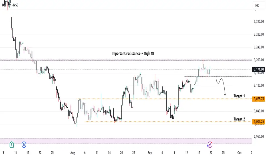 Currently, TCS is trading near the crucial resistance zone of ₹3200, which also carries high open interest. From a technical perspective, if the stock breaks and closes below the short-term support of ₹3150, we can look for a short entry on retest, with targets:
