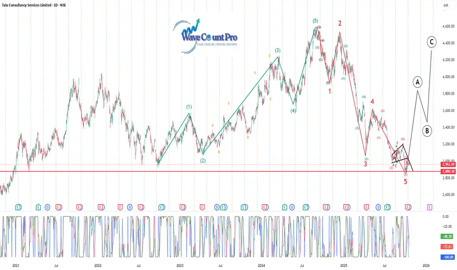 Holding above ₹2,880 will confirm strength, potentially leading to an A–B–C recovery toward ₹4,400 levels.