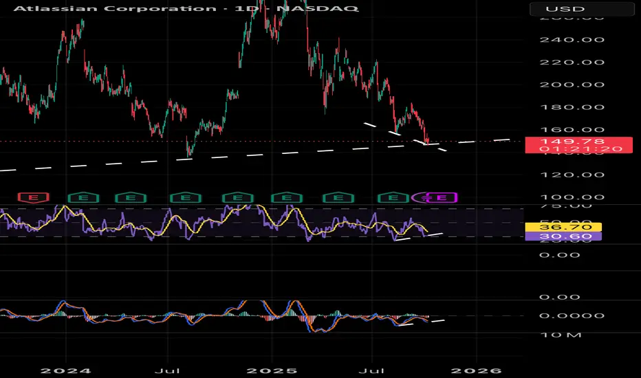 TEAM is making its fifth touch off of this ascending trendline. There is also bullish divergence observed using RSI and MACD.