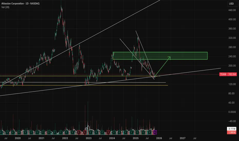 - TEAM has broken long descending wedge and is forming new structure after trend reversal.