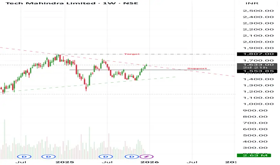 Tech Mahindra is trading inside a tightening weekly structure formed by a descending trendline from the previous highs and a rising support line from the recent lows. This price action indicates compression, suggesting that the stock is building energy for a directional move.