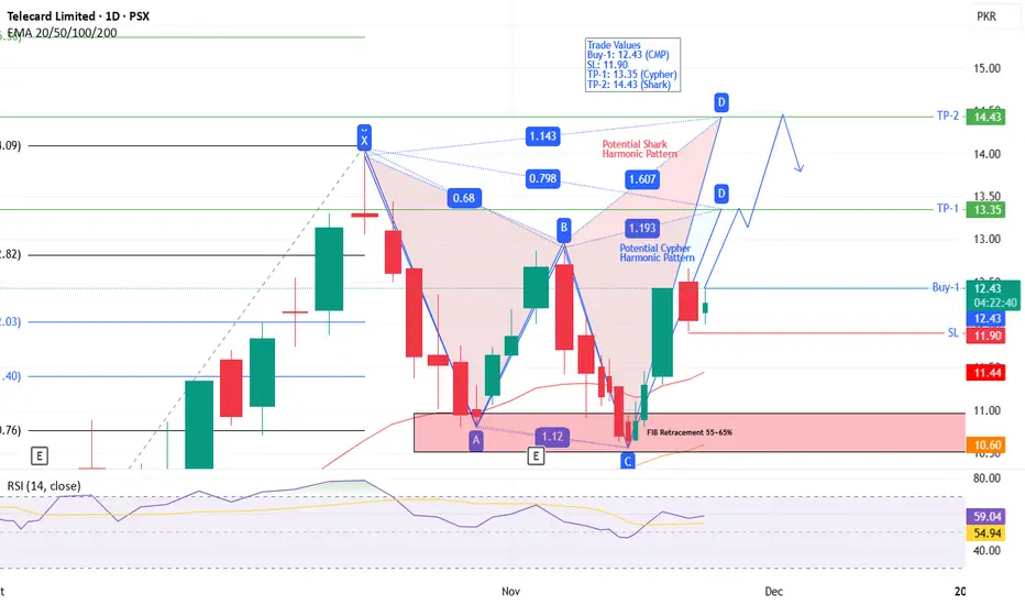 On Daily time frame, TELE price has bounced twice from Fib 55~65% region. Now it is potentially making two harmonic patterns i.e. Cypher and Shark. RSI is also around 55 means it has space to go up to 70 to 80 easily. Trade spanning over 2 weeks in sight.