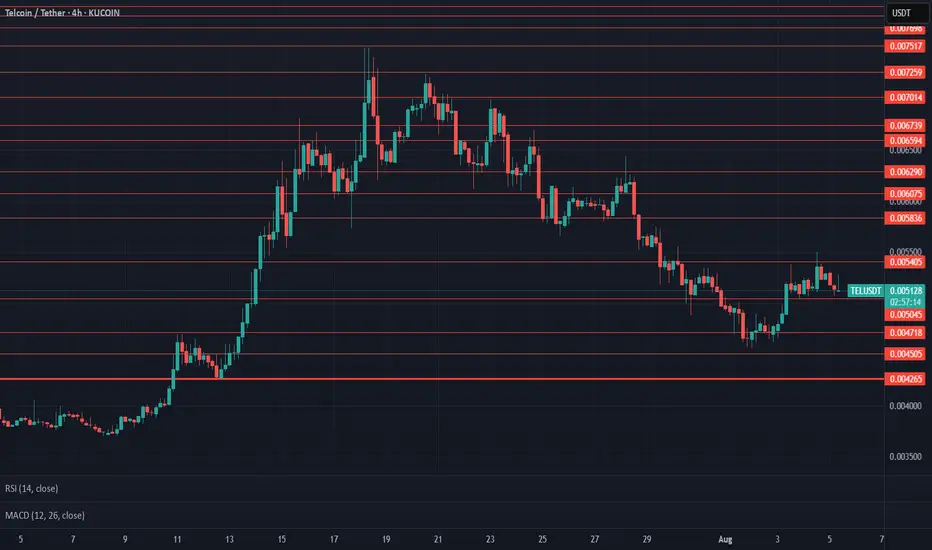 TEL on $0.005045 support as of now, $0.005405 resistance in effect, Current 4H looking bearish with 3 hours to close, RSI on 4H neutral, $0.004718 key support from here, $0.005836 next key resistance, Gaining $0.006290 support will allow $0.006739 test, Closely following #Bitcoin.