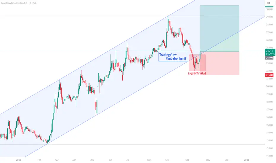 TGL continues to trade within a well-defined ascending parallel channel, maintaining its long-term uptrend structure. Recently, the price briefly broke below the lower boundary of the channel, triggering a liquidity grab before swiftly reclaiming the channel support. This move suggests that downside liquidity has been absorbed and buyers have regained control.