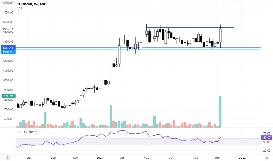 Thermax has been trading in a range [1550 - 1300 ] since March 2021.