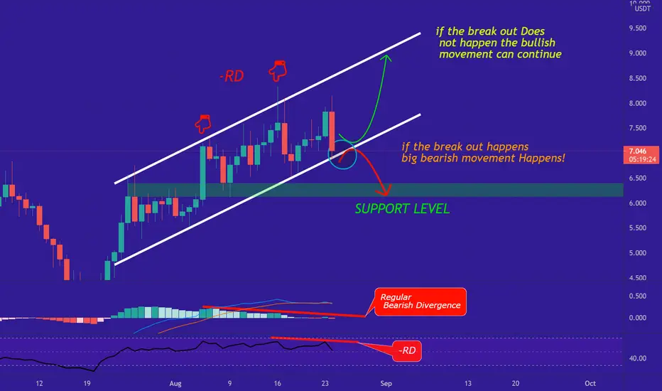 THETA/USDT is in an ascending channel. the Price has a chance to Remain in the Channel but there is also a Regular Bearish Divergence (-RD) on RSI which suggests a Great Bearish Movement!