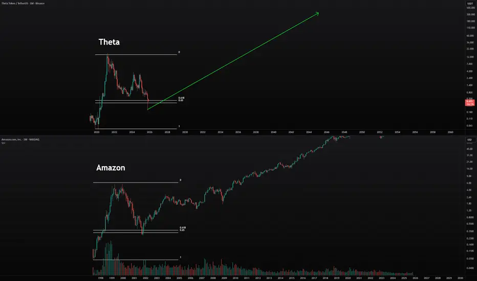 Today, I take a look at a long-term analysis of Theta, comparing it to Amazon. I believe Theta will perform very well in the big picture. I see it following a major upward trend similar to Amazon’s. However, it could happen much faster than shown on this chart—be ready for big things in this market.