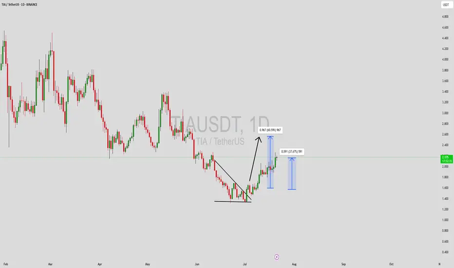 TIAUSDT has recently shown a bullish breakout from a falling wedge structure on the daily timeframe—a pattern known for its strong reversal signals. This move is supported by rising trading volume, signaling fresh momentum entering the market. With current price action pushing higher, the short-term upside potential targets lie around the 50% to 60% gain zone, which aligns well with past resistance levels marked on the chart. This upward shift also breaks the series of lower highs that previously dominated the chart, suggesting a confirmed trend reversal.