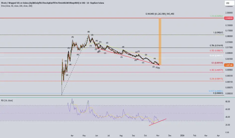 I trien to count 5 waves down 5 times, now at the 0.5 fib with a daily bullish div. Hope this is the bottom and we'll aim for 0.9.