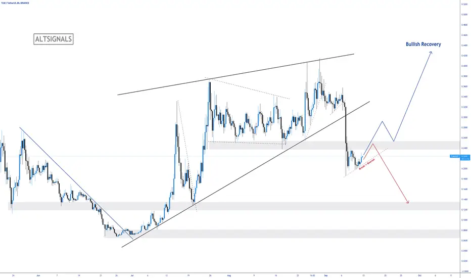 TLM was making really nice gains until the recent drop in the market. Now we are at a point where we can either make a bullish recovery or carry on with this bearish move back down to one of the previous structure levels.