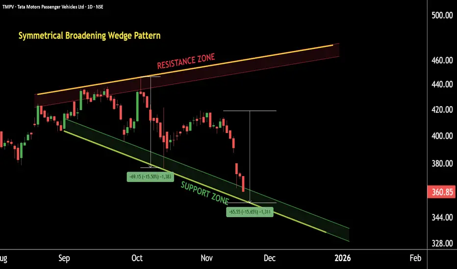 TMPV is forming a Symmetrical Broadening Wedge Pattern with a key support zone near the 345–350 range.
