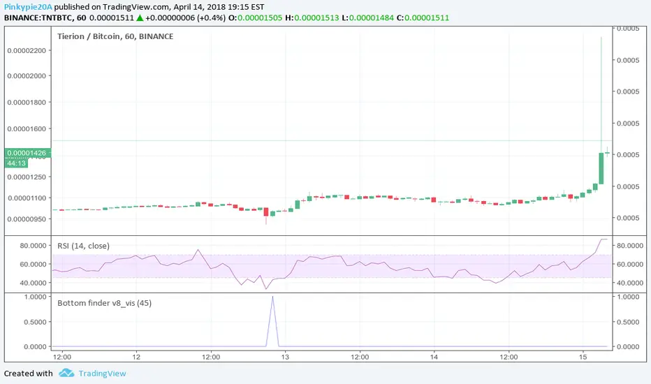 TNT/BTC: buy alert at 960 (3days ago 12/04), jumped to 2300 today. GAIN= 240%. From Bottom Finder script v8, default settings buyrsi45, sellrsi87, 1hr. Why wait ? Message me for trial access today.