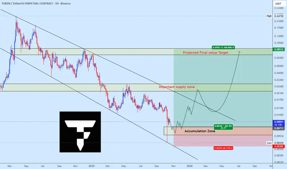 TokenUSDT has continued its downtrend but shows signs of a potential reversal after a sharp decline towards the $0.0043 demand zone. The price has bounced from this level, indicating strong buyer interest. Look for re-accumulation around the current bounce zone and aim for the projected upside targets as outlined on the chart. Place a stop loss below the most recent low (presumably below the $0.0043 bounce level) to protect against the downtrend resuming.