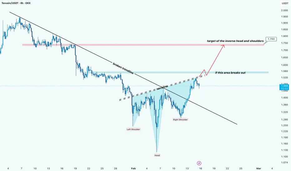 Price has broken the main descending trendline and is now forming an inverse head and shoulders pattern. The right shoulder is developing while price is testing the neckline resistance zone.