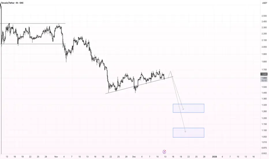 Price is breaking below the local ascending trendline, signalling a potential shift in short-term momentum. If the breakdown holds, I expect a continuation to the downside toward the next support zones. My targets are $1.33 as the first demand area and $1.10 as the secondary, deeper target.