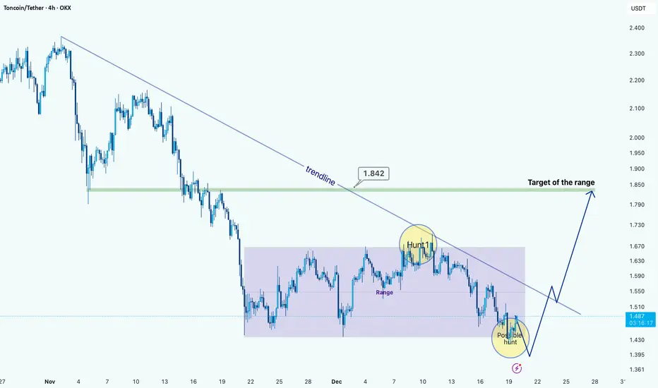 TON is still trading under a well-defined descending trendline, confirming that the higher-timeframe structure remains bearish. After the impulsive sell-off, the price transitioned into a clear consolidation range, highlighted on the chart. This range shows multiple reactions at both extremes, validating it as an accumulation/distribution zone rather than random price action.