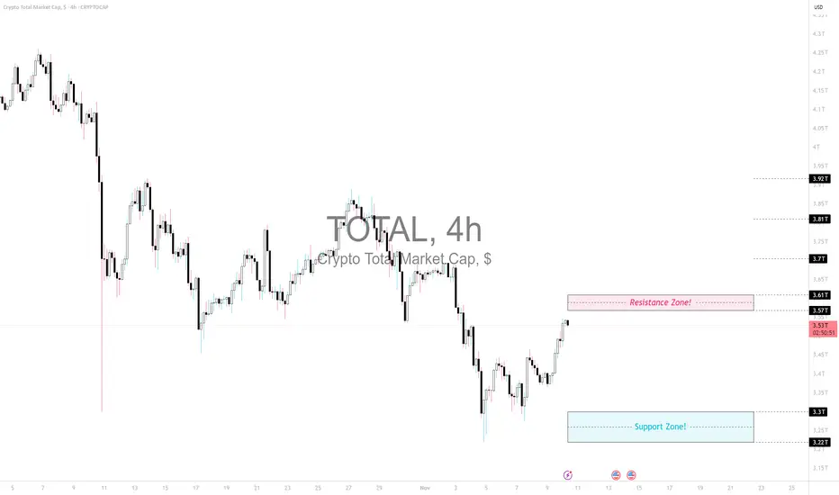 The total crypto market cap is currently moving within a corrective bullish wave, following a strong rebound from the Support Zone between $3.22T – $3.30T, which has acted as a clear demand area in recent sessions.