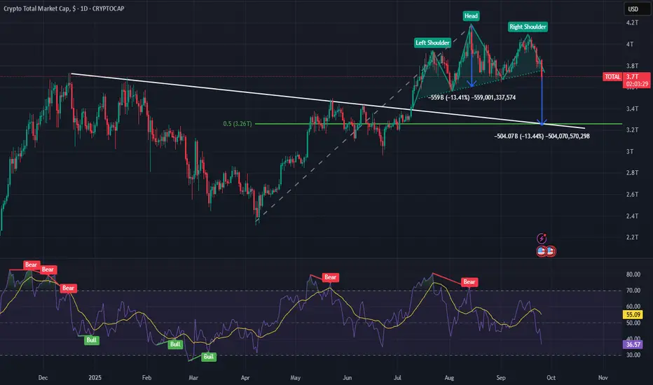 TOTAL chart appears to be forming a Head and Shoulders pattern, which typically signals a potential bearish reversal. Based on the recent high observed on 14 August 2025, the percentage decline from that peak to the neckline of the pattern is approximately 13.4%. If this pattern plays out as expected, it suggests a further downside of around 13.4%, equating to roughly $500 billion, which would bring TOTAL’s market cap down to approximately $3.26 trillion.