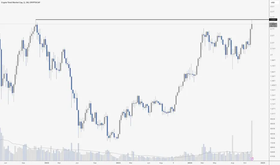 This is not an altcoin chart, per se, but it is very telling. This is the Total Marketcap of Crypto, including both Bitcoin and Ethereum. As you can see, this reached the all time high from the previous bull market, which was hit in November of 2021 - right around $3T.