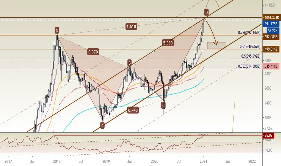 Crypto Total Market Cap is forming a Bearish Butterfly Pattern as well as hitting the top of an ascending channel that it's ranging in for the last two years. I expect a correction to $500B which is %61.8 of the CD wave of the pattern, after hitting $1,051B. In another case it can break $1051B to the next dynamic resistance at $1,700B - $1,800B.
