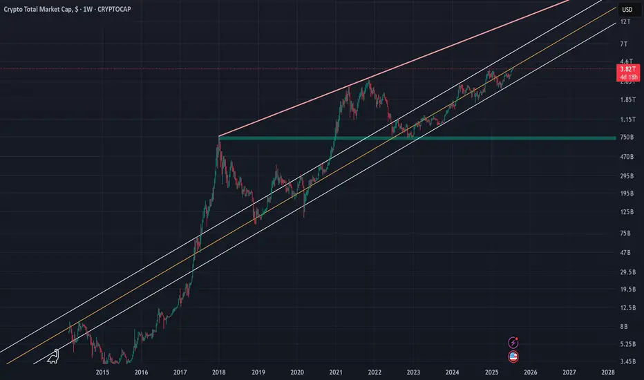 The crypto market cap represented by the symbol TOTAL can be considered the most important index for analyzing the cryptocurrency market, although I believe that analyzing Bitcoin itself, given its strong positive correlation with the TOTAL index, would yield similar results. In the attached image, the red line actually indicates the overall resistance level of the symbol, and the drawn parallel channel illustrates the current upward trend of the TOTAL symbol, which is now on the verge of encountering its round resistance at 4 trillion dollars. While we should expect a correction around this level, breaking through the 4 trillion dollar resistance could likely lead to a market cap of 6 to 7 trillion dollars in the next phase. On the other hand, with support at 2.4 trillion dollars based on the 100-week SMA on the weekly timeframe, the 750 billion dollar level—marked by a green zone in the image—can still be considered the most important long-term market support, even before the fifth halving.