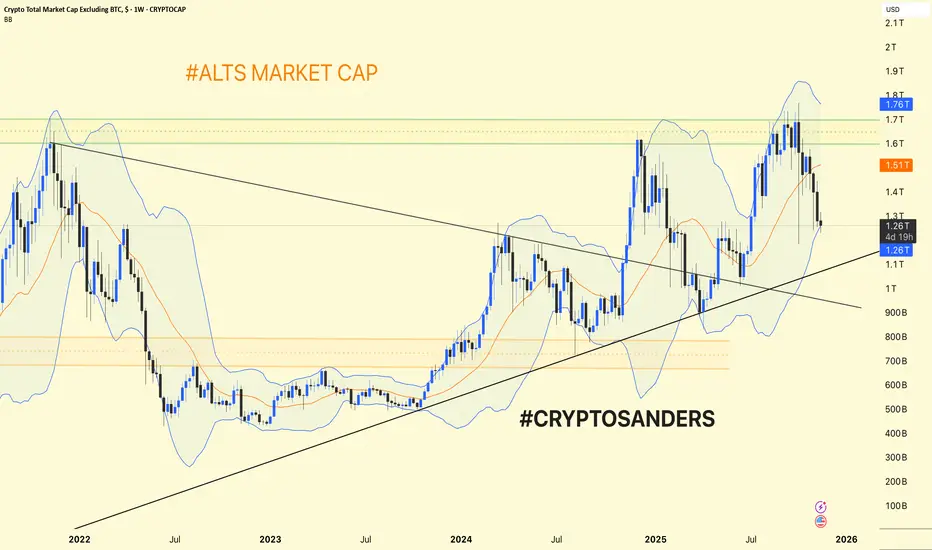 Alts are consolidating at higher lows inside an uptrend. Holding above the $1.25T area signals strength; a break above $1.51T confirms fresh upside momentum, while losing $1.25T would signal caution for further corrections.