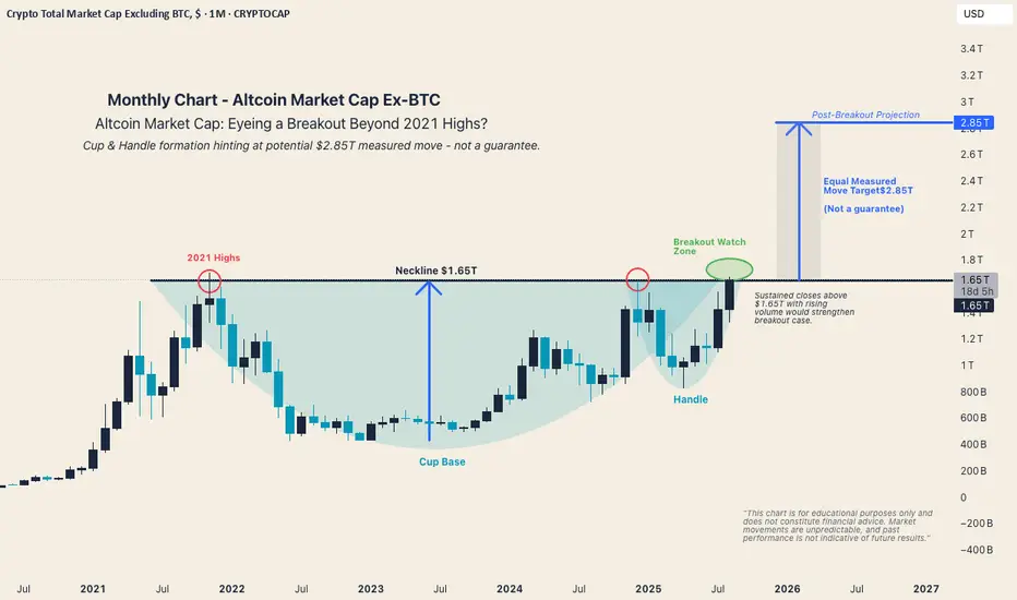 The altcoin market cap (ex-BTC) is retesting the $1.65T resistance, the same zone that marked the highs in 2021 and early 2025.