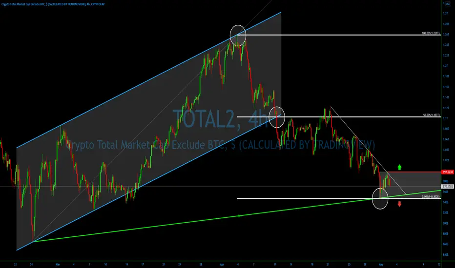 💎On April 30, TOTAL2 had reached and rejected two technical indicators at 966.832B. The first is an 8/1 Gann Fan trendline and the second is a 0% Fibonacci level. We applied the Fibonacci so that 50% is placed right at the ascending channel breakout point. This way, Fibs show that after the breakout, the price has dropped the same distance as the width of the channel.