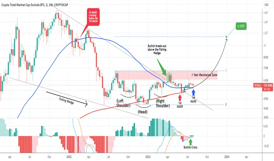 The alt coin market (TOTAL2) following April's break-out above the Falling Wedge of the Bear Cycle that started in mid 2021, has pulled-back, tested both the 1W MA50 (blue trend-line) and 1M MA50 (red trend-line) as Supports. Currently we are seeing the 1W MA50 holding, having closed the last 6 candles above it. The technical Resistance is the 1 Year Zone within 618 (where the price got recently rejected) and 700.